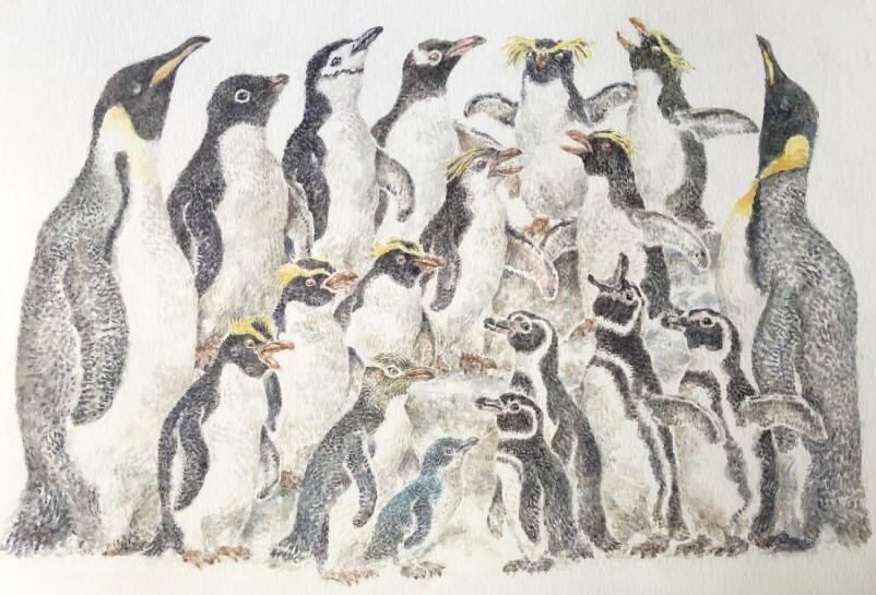 世界にいるペンギン全18種を大きさの比率もだいたい揃えて描いてます。