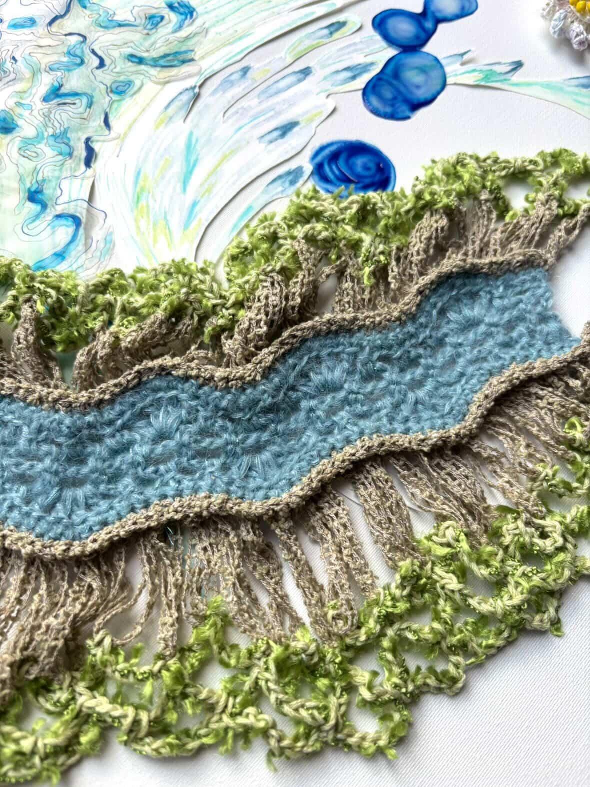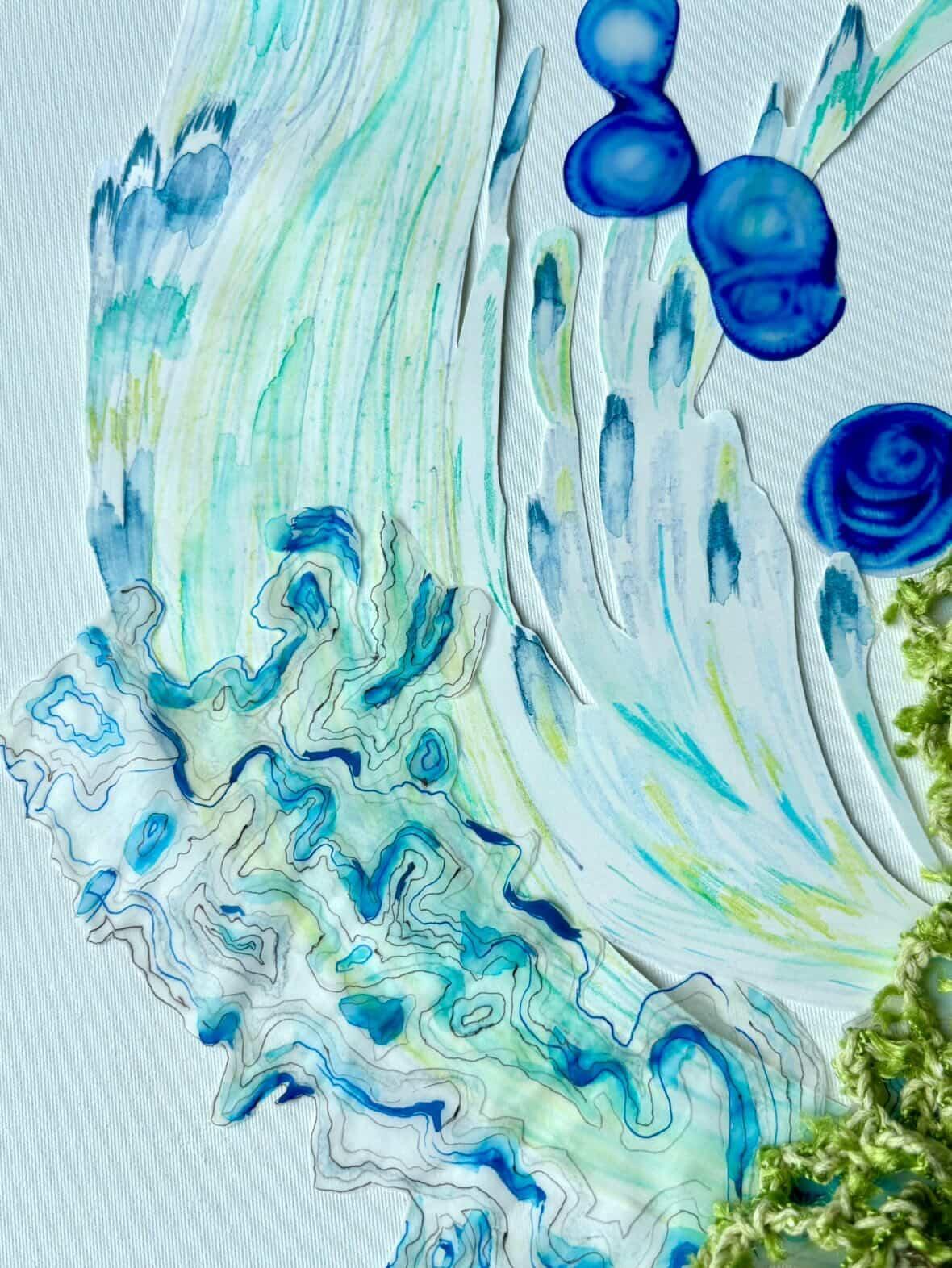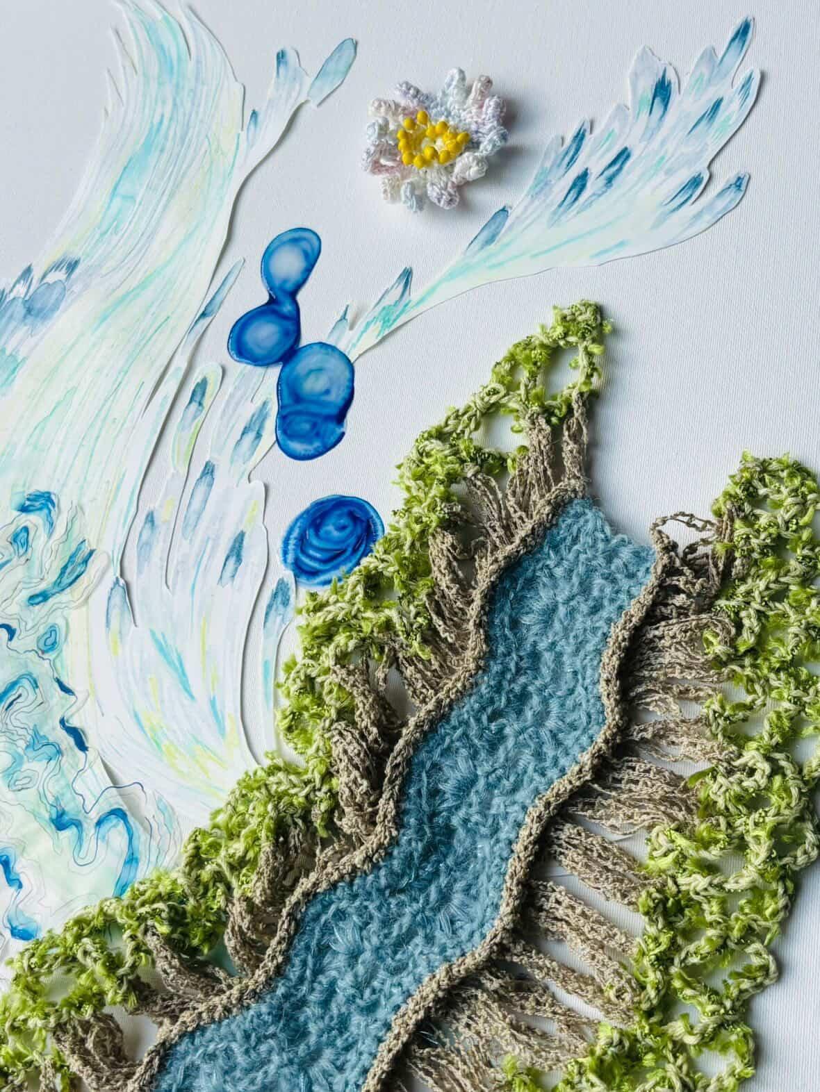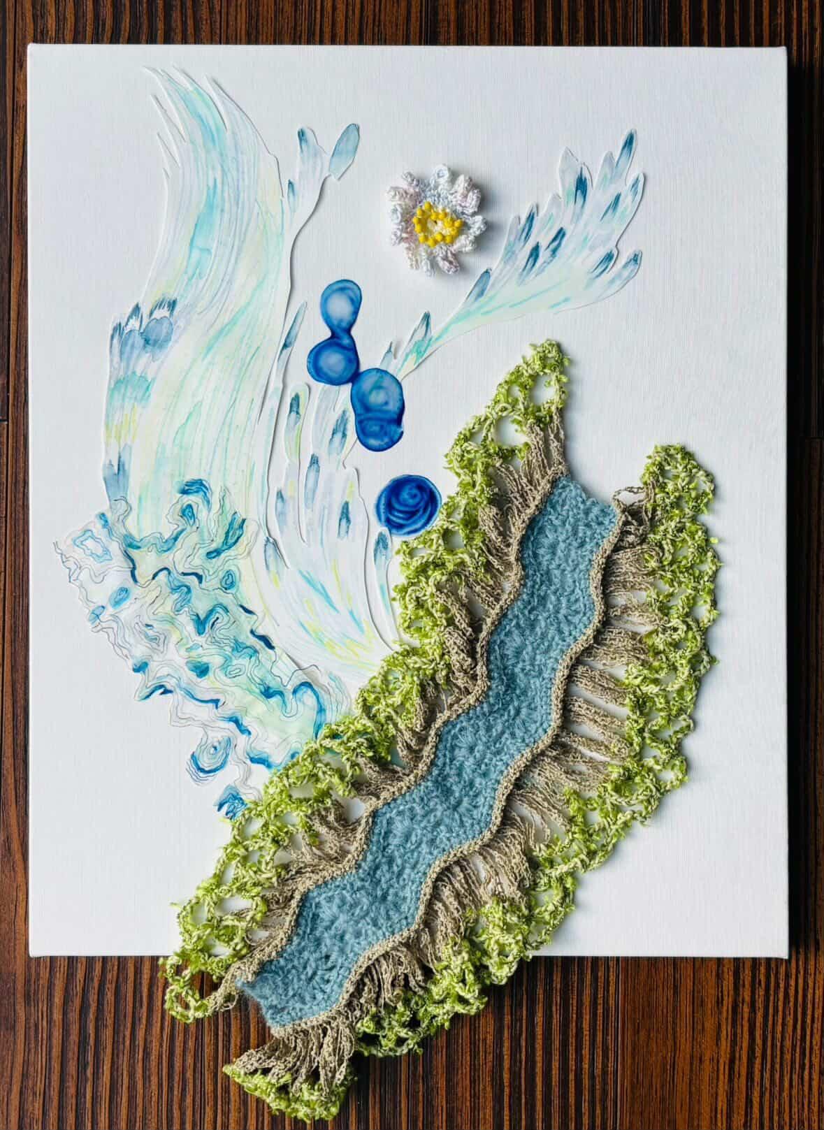 またニット、水彩画、インクを混ぜたジェル状の素材の融合もお楽しみください。