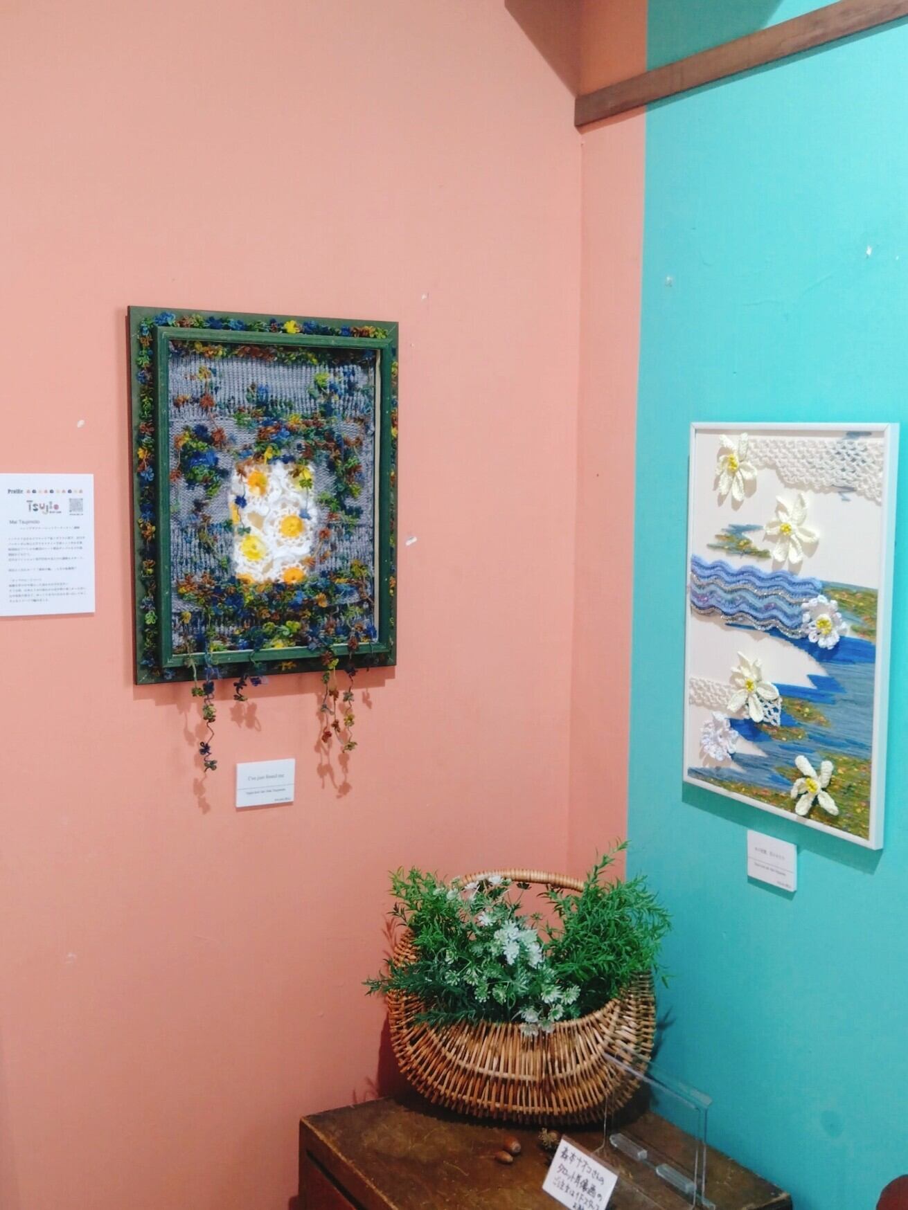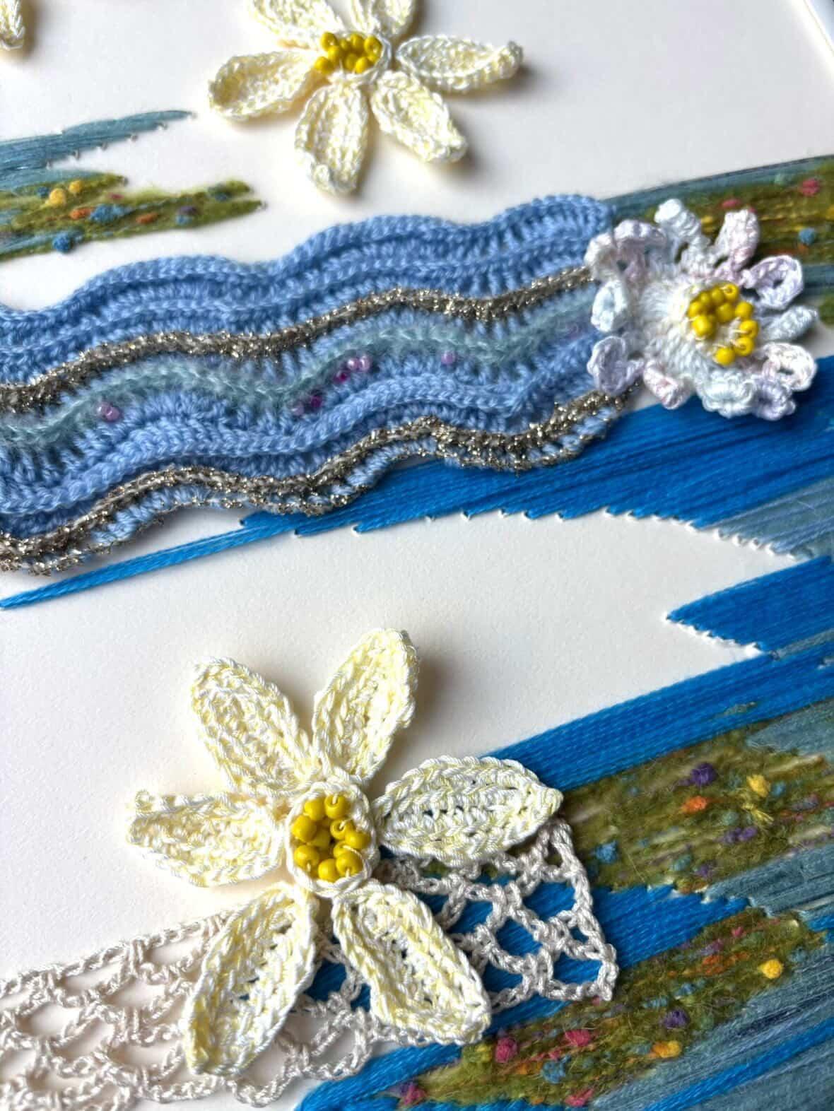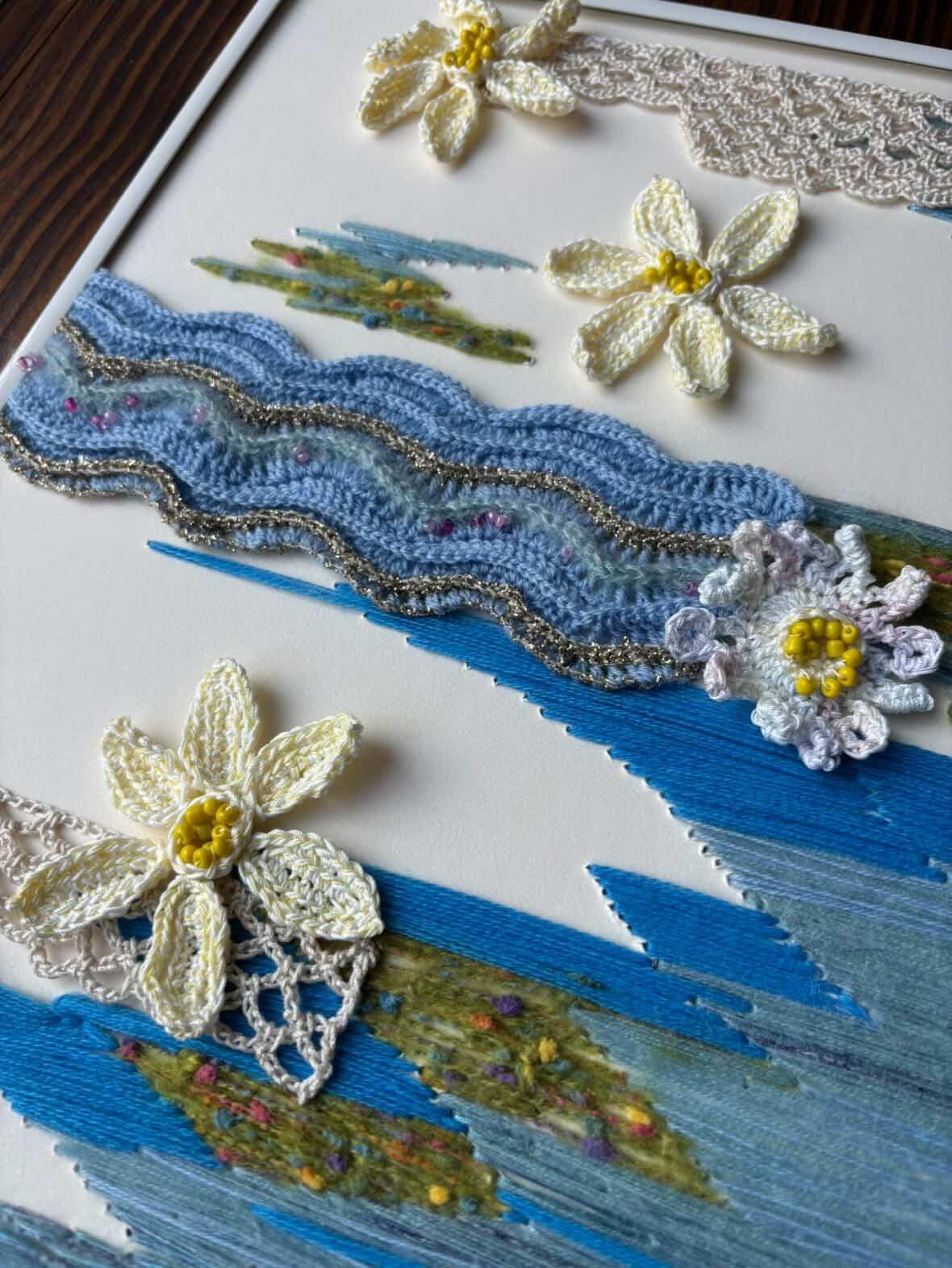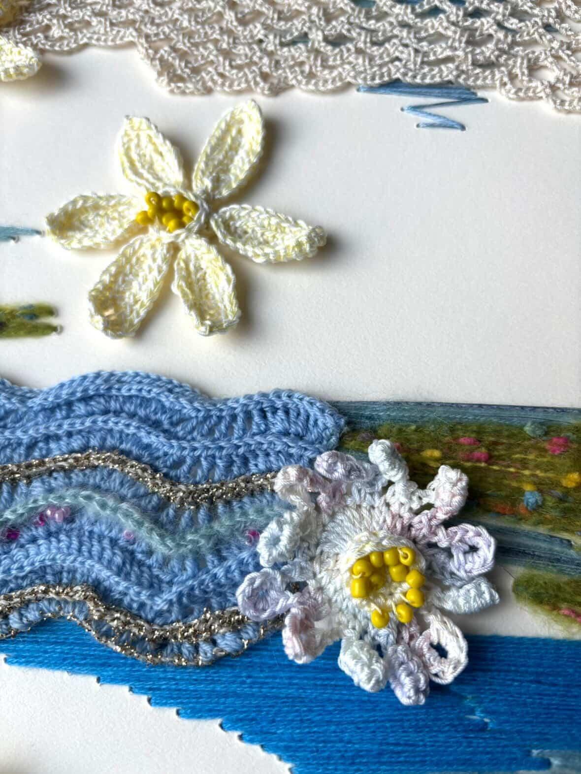 板に直接刺繍したり波模様、お花モチーフ、鎖レースなど様々なニットの技法と、色んな糸でメルヘンに仕上げました。
